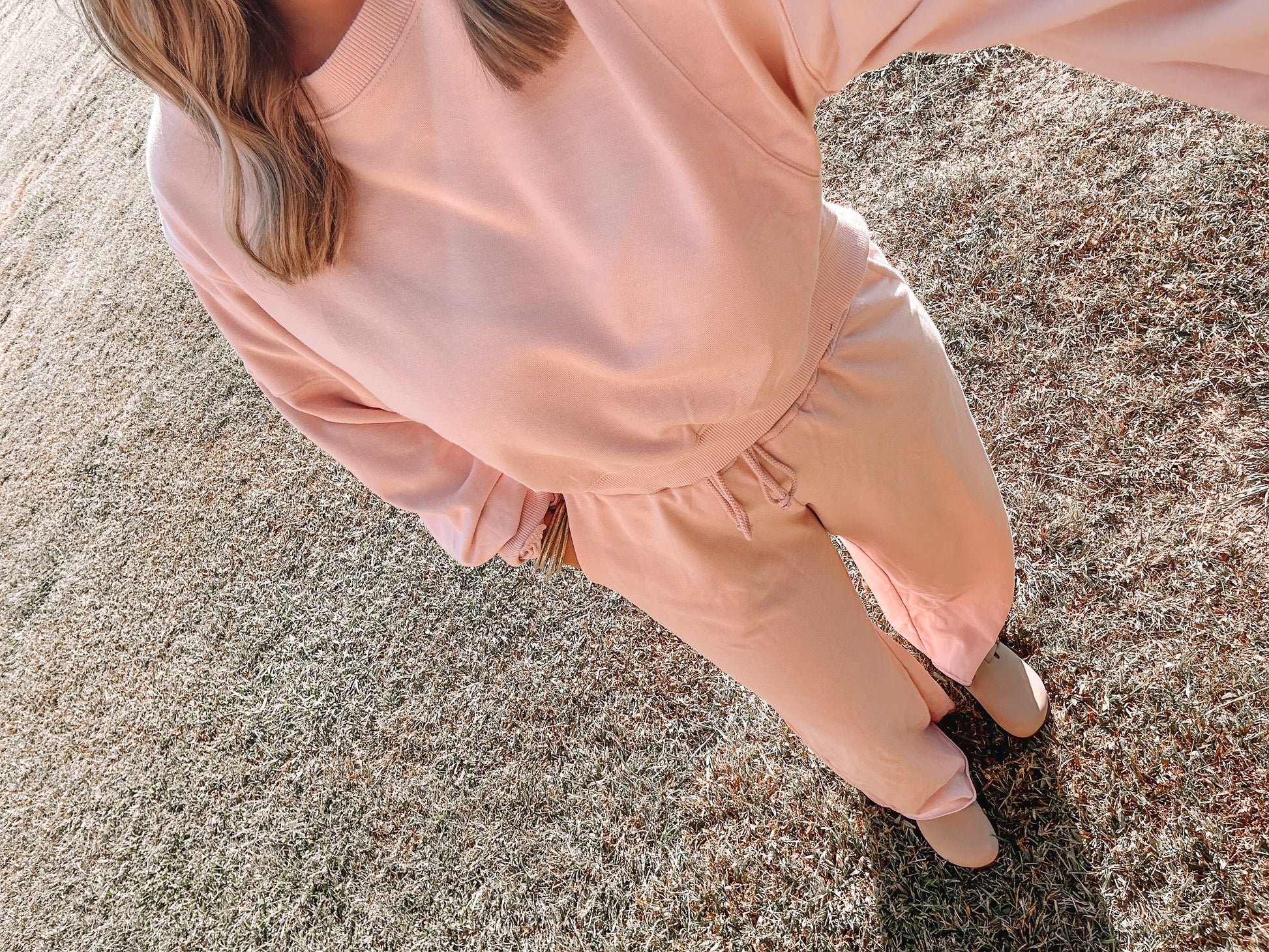 So stinking cute and COMFY! The top is a little bit cropped, but pants are extremely high waisted so no belly shows. Wide-legged pants with drawstring. 65% polyester and 35% cotton.
